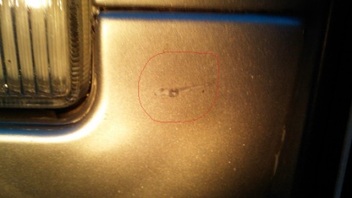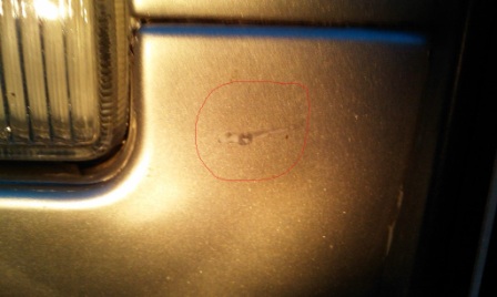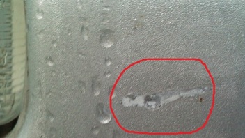 Die Schramme hat in der Mitte eine Kugelrunde Ausbuchtung, aus der auch Material (Plastik) fehlt.