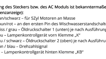 dann alle Signale vom LKG und Wischwasser auf Masse legen, 4/5 entscheiden (wie Marvin schrieb ob 4 oder 5 Zylinder) und ich meine 3 Signale für Öldruck usw vom MC übernehmen