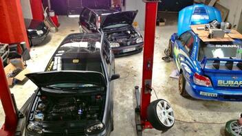 doof nur wenn man dann wirklich mal auffe Bühne will, weil in der Halle immer die Größeren Pojekte (z.b. der Subaru oder der Golf 1 der links in einer der Parkboxen zu erahnen ist) stehen und die eigneltich echt großen Räumlichkeiten zuparken