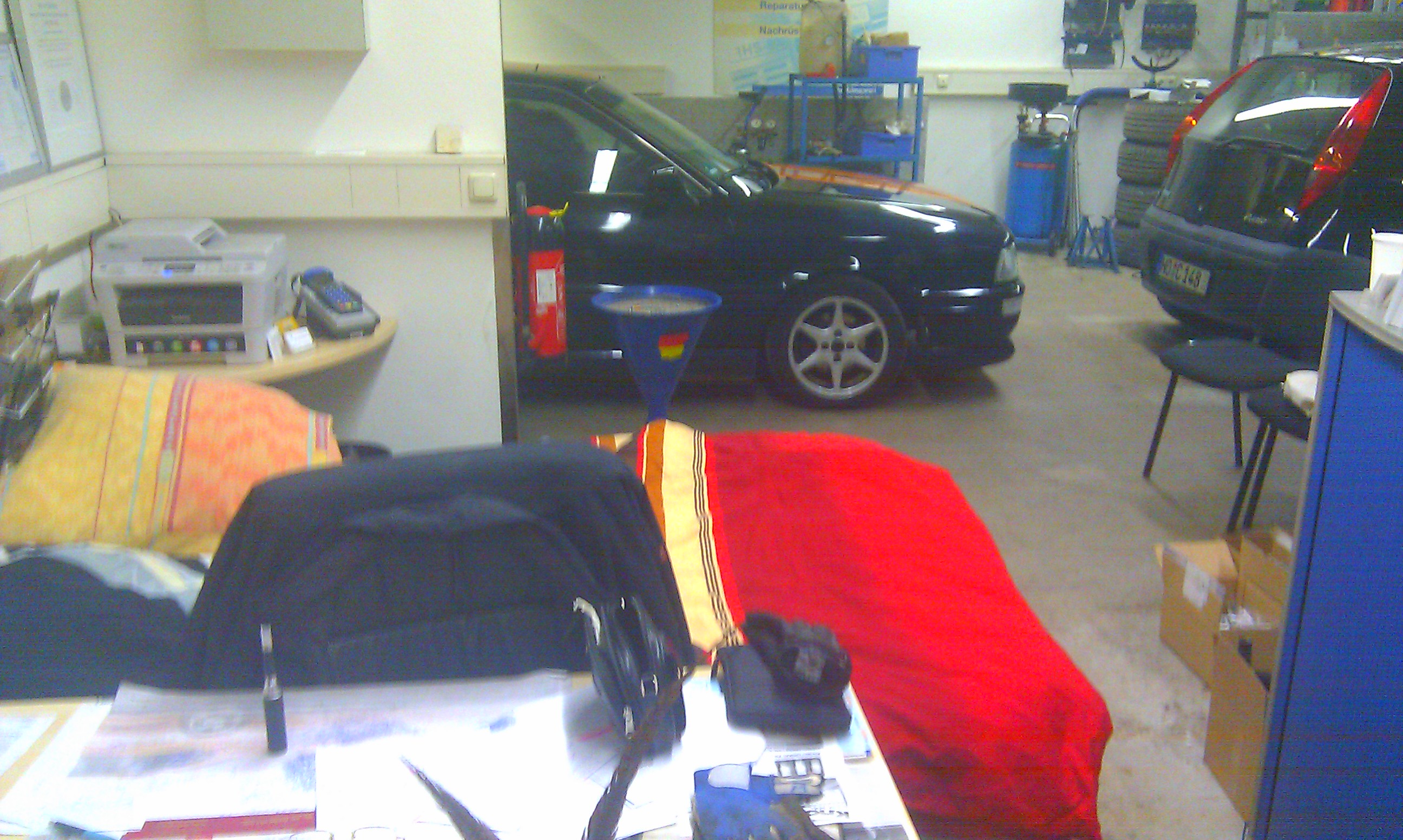 doof nur wenn man dann wirklich mal auffe Bühne will, weil in der Halle immer die Größeren Pojekte (z.b. der Subaru oder der Golf 1 der links in einer der Parkboxen zu erahnen ist) stehen und die eigneltich echt großen Räumlichkeiten zuparken