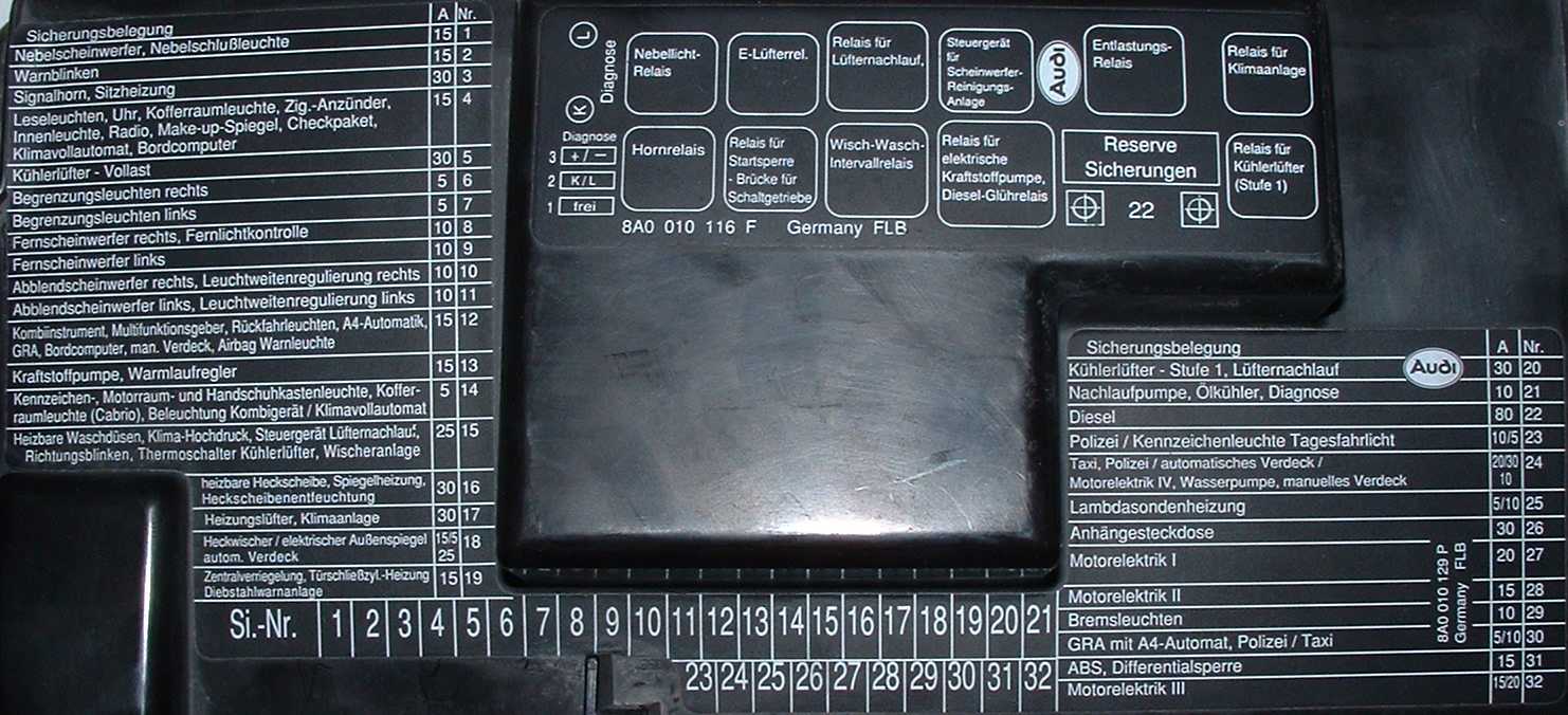 ich brauche für meinen B3 BJ.86 ein neues Radio, das alte ist kaputt. Nun stellt sich die Frage, über welche Sicherung das Radio angeschlossen ist. Im Sicherungskasten im Motorraum kann ich keine Sicherung finden die mit "Radio" o.ä. bezeichnet ist. Ich weiß das bei meinem alten Radio auch eine Sicherung drin war, aber gibt es noch eine zweite? Oder sind Radio (auch neue) generell mit einer eigenen Sicherung versehen?