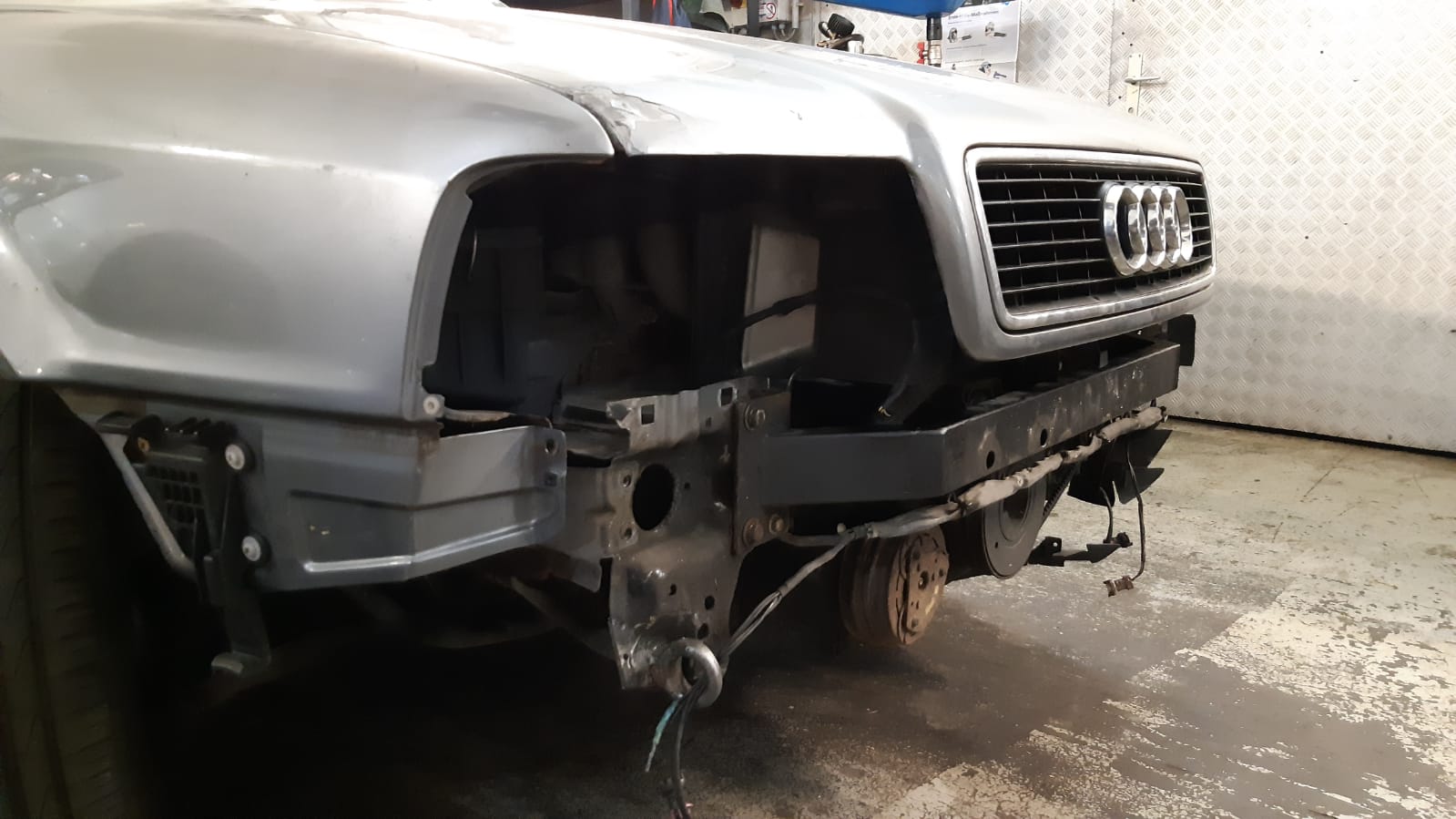 So, bissl Blech rausgeklopft, bissl den Formrohrquerträger (welcher mir fett den Arsch gerettet hat) geradegebogen, bissl die Längsträger mit dem Stapler zurechtgezogen, neuen alten Kotflügel drauf und die Welt sieht schon wieder ganz anders aus.