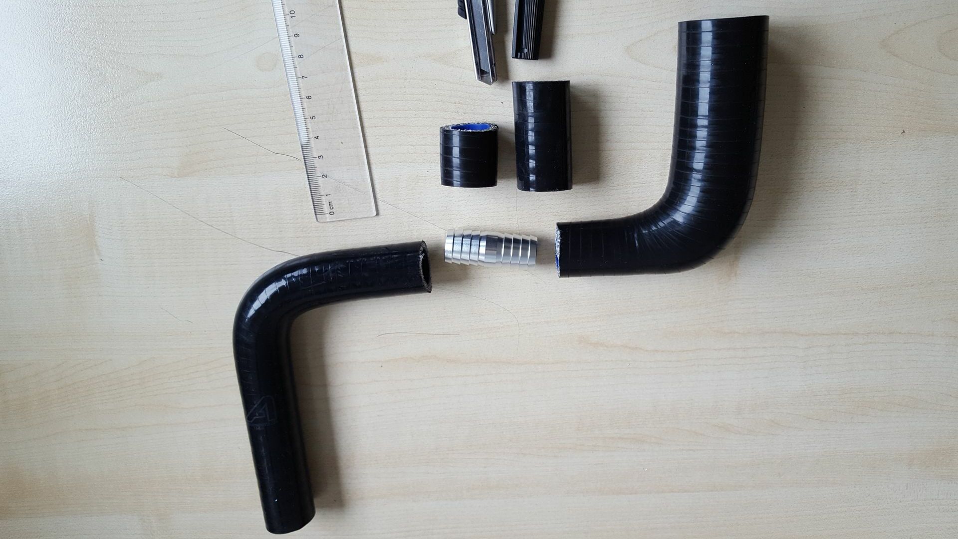 Bei den Silikonschläuchen habe ich jeweils einen der Schenkel (Bei der Verjüngung den Schenkel mit den 19mm Durchmesser) auf etwa 7cm gekürzt.