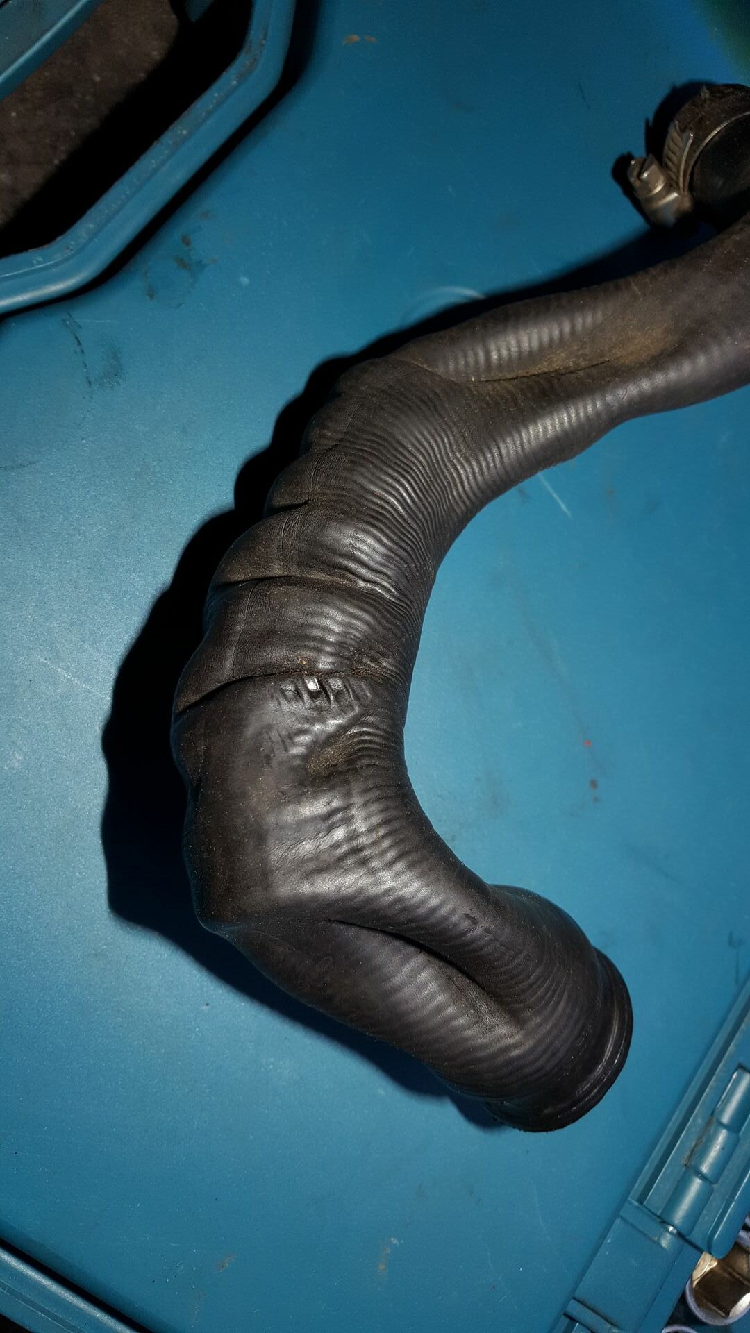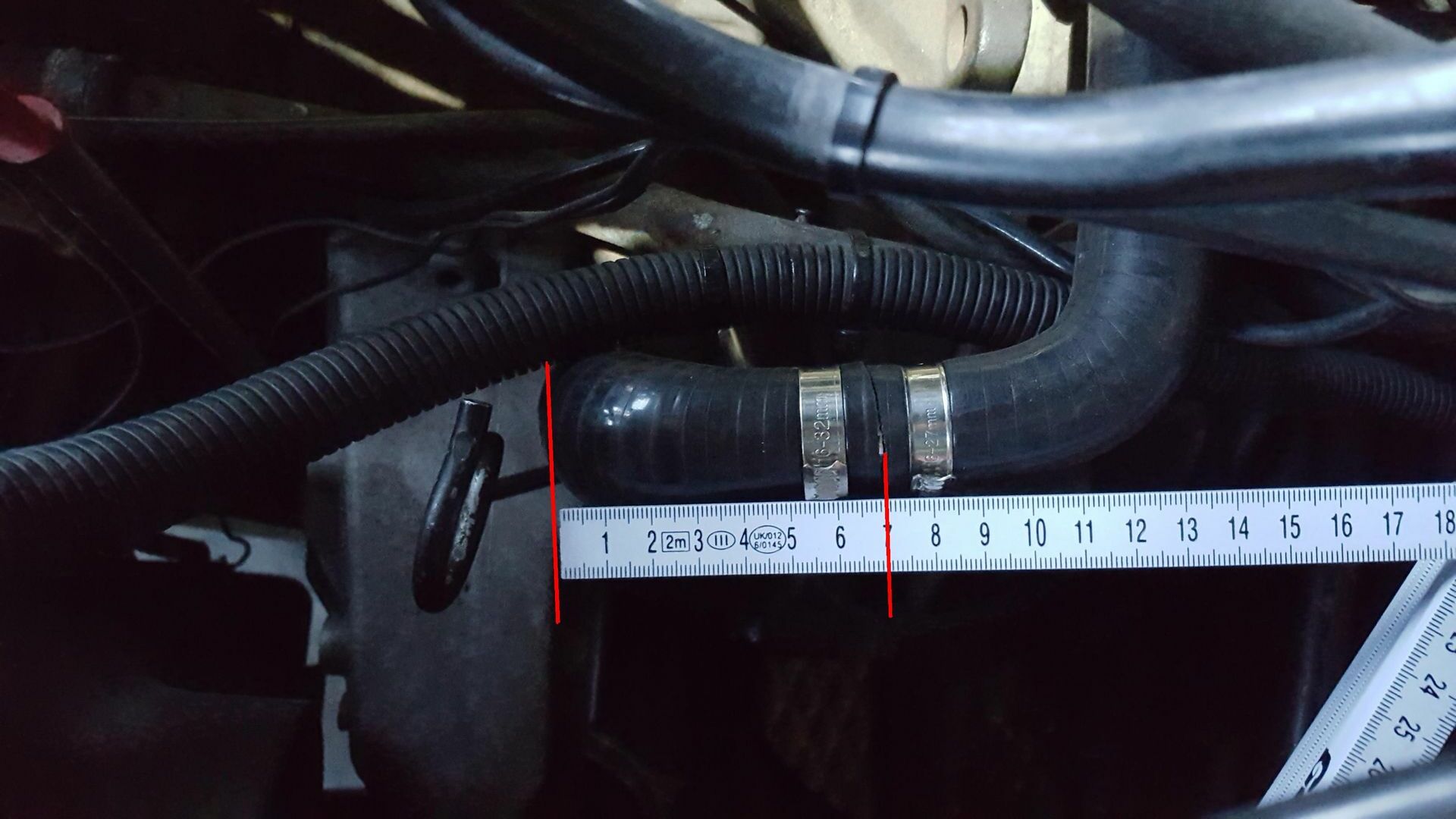 Ach ja. Das Metallrohr hinter dem 5. Zylinder hat einen gemessenen Durchmesser von 18mm. Der 19mm Schlauch geht leicht drüber aber das passt schon so. 18mm Schläuche habe ich nicht gefunden weil 19 eine Normgröße zu sein scheint. Der große Anschluss am Block hat gemessen 30mm wie der Schlauch. Passt auch sehr gut.