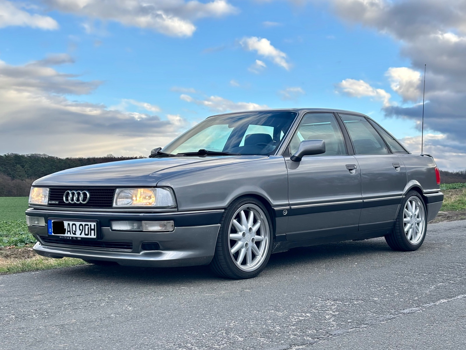 Ich habe heute meine fertige Stoßstange mit dem Kamei Frontansatz von Audi Tradition an dem 90er montiert, da kann ich Quattro auch gleich mal komplett zeigen