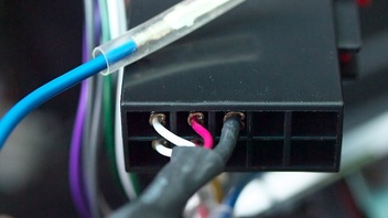Die zwei Cinch-Stecker sind schon richtig, die sind radioseitig, nicht lautsprecherseitig. Lautsprecherseitig ist die 10-Pol-DIN-Aufnahme für den roten Stecker, der von den Aktivlautsprechern kommt. Wie man sieht, hat der allerdings noch drei Leitungen, die in der Adapterbuchse leer sind. Das hab ich jetzt noch nicht herausgefunden, was ich mit den drei Leitungen mache, bzw. womit ich den Remote-Anschluss verbinden muss.