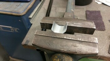 Als Grundlage dient ein verzinktes Blech mit einer Kantenlänge von 30mm * 55mm. Das hab ich dann auf einem Rohr mit 36mm Durchmesser gerundet. Zuvor die Schnittkanten entgratet. Die Kanten an der 30mm Seite müssen leicht "spitz" gefeilt werden um später besser in die Rillen zu passen.
