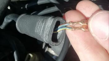D.h. die zwei Kontakte hängen jetzt lose an den zwei Kabeln: eines ist gelb-blau und eines ist braun-blau.