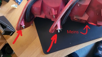 Ursache ist, dass der/ die Bolzen gekürzt wurden (und vermutlich das Blech der Karosse entsprechend anders gebogen). Als Ersatzteil gibt es immer nur die Leuchten mit "neuem" kurzem Bolzen.Für Deinen Fall wurde jedoch ein "Adapterteil" vorgehalten, unter der Teilenummer 8A5.945.185 gibt es das bei der Tradition. Kannst Du Dir da anschauen, daraus ergibt sich auch, wie das umzubauen geht.