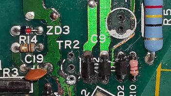 Der Schuldige auf der Platine ist entweder Widerstand R5 oder Kondensator C9.