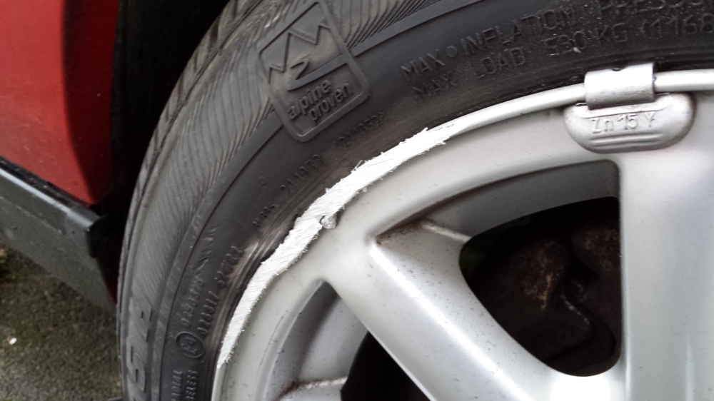 Nun ist aber die Felge vorne rechts beschädigt (siehe Bild) und ich weiss nicht ob ich den Reifen sowie die Felge noch ruhigen gewissens verkaufen kann.