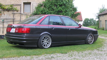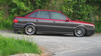 Audi 80 B3 Limo. Bj.1990,Front. hatte original 3A Motor, umbau auf NG 1. Generation, Umbau auf 2,5L Hubraum durch andere Kurbelwelle, Zylinderkopf Ansaugbrücke Drosselklappe bearbeitet/poliert, Umbau auf mechanischen Ventiltrieb (Tassenstössel statt Hydrostössel), dbilas Nockenwelle, Motorsport Ein- und Auslassventile, Ram Air Kit, K&N Luftfilter, Umbau Kurbelgehäuseentlüftung mit K&N Filter, TEZET Fächerkrümmer mit Hitzeband eingewickelt, BN-PIPES Abgasanlage ab Kat, Zusatzwasserkühler vom RS2, Leistung ca. 200 PS, Einspritzleitungen, Schloßträger, Ventildeckel + ... verchromt, polierte Ansaugbrücke, Sandtler wärmebehandelte Bremsscheiben, Fischer-Hydraulik Stahlflex Bremsleitungen, H&R Gewindefahrwerk, Brock B6 9x16 VA ET 30 HA ET 15 SLC-Chrom, Hankook 215/40ZR16 86W Ventus V12 evo, stärkerer Stabilisator, B4 Front, RS2 Kühlergrill & Spiegel, SGI Frontstoßstange, Rieger Seitenschweller & Heckstoßstange, Kotflügel VA gebördelt, Radhäuser HA gezogen, Sonderlackierung "Spezialrot" Perleffekt & Java-Grau (original Audi), Türgriffe lackiert, Dayline Scheinwerfer, US Heckleuchten, Passat Wischerarme & Aero-Wischerblätter, Windschutzscheibe getönt mit Graukeil, RAID Lenkrad, Sitze und Türverkleidungen in echt Leder schwarz/rot, Himmel und alle anderen Verkleidungen sowie Sonnenblenden und Haltegriffe in schwarz gefärbt, Autoradio JVC KD-LHX501, Eton Front- Hecklautsprecher, Jehnert Doorboards (noch nicht verbaut), Pyle Basskiste (Kofferraumausbau folgt noch), 2 x GroundZero Verstärker, ...