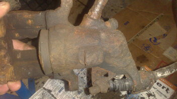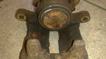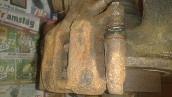 Die hinteren Sättel sind jetzt auch runter, sehen genauso beschissen aus. Wenigstens konnte ich nach dem Ausbauen den Zylinder mit der Rohrzange noch ein bischen hin und her drehen. Ich werd die jetzt so gut es geht zerlegen und entrosten.