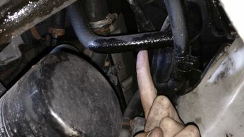 Noch einmal ein kleiner Hinweis von mir zu dem Bild. Das Photo ist von unten durch den Motor nach oben gemacht. Man schaut also gerade von unten durch den Motor auf der rechten Seite (auf den Fahrersitz blickend). Der Motor ist ein V6 mit Servo. Der gezeigte Schlauch kommt vom Kühler (nicht 100%ig sicher gerade) und läuft dann unter der Batteriehalterung hindurch, weiter nach hinten Richtung Armaturenbrett (nicht zum Kühlmittelbehälter). Und genau unter der Batteriehalterung scheint das Loch zu sein.